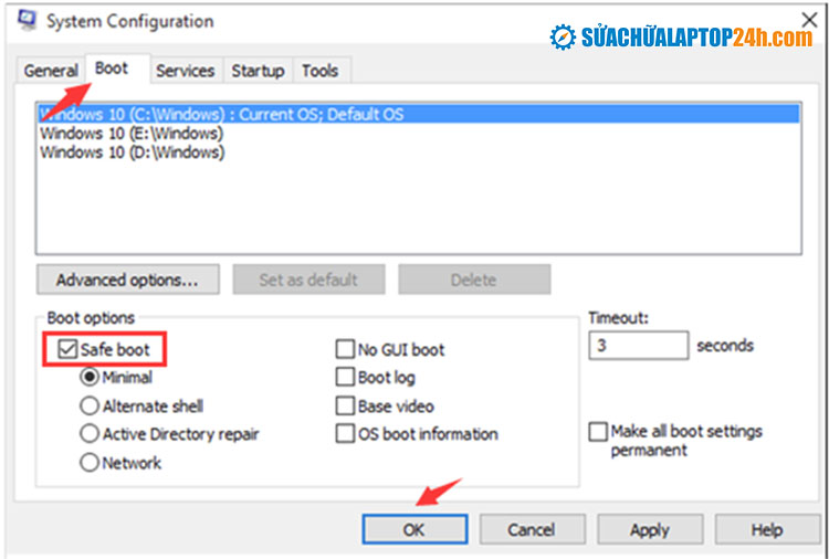 Bước 3: Chọn tab Boot > Phía dưới Boot options, bạn chọn Safe boot > nhấn OK.