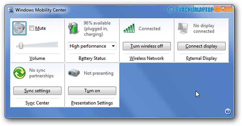 - Bước 1: Bạn hãy nhấn tổ hợp phím tắt Windows + X và chọn Mobility Center để mở cửa sổ Windows Mobility Center.