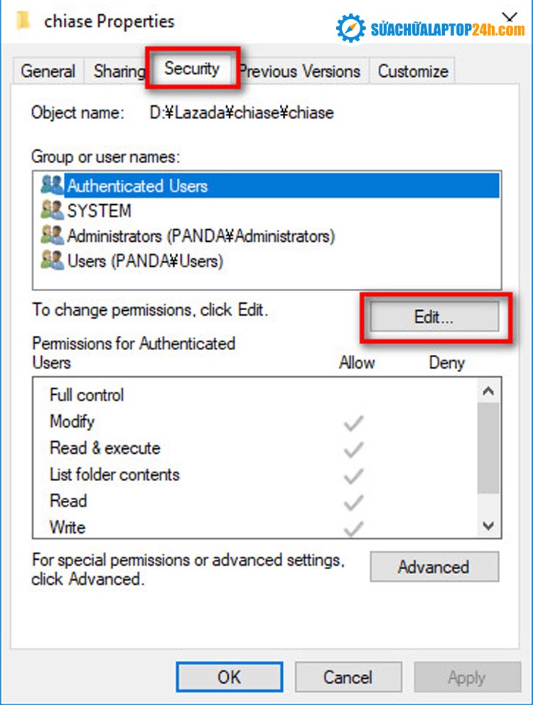 Bước 3: Bạn chuyển sang tab Security rồi nhấn vào Edit... ở bên dưới.