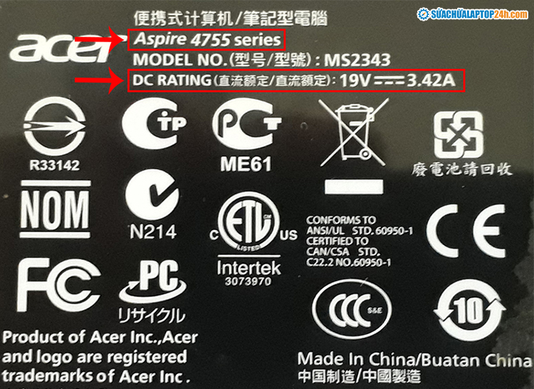 Mã laptop Acer Aspire 4755 có điện áp đầu vào 19V-3.42A: