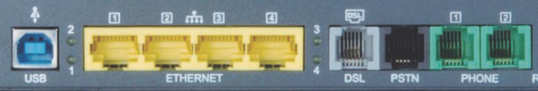 Cổng mang dấu hiệu DSL hay Line dùng để cắm cáp ADSL từ nhà cung cấp dịch vụ vào Router. Các cổng Ethernet hay LAN dùng để nối với các máy tính trong mạng. Cổng USB dùng để nối Router ADSL vào máy tính qua cổng USB với cáp đi kèm. Cổng Phone thường chỉ xuất hiện trong các Router ADSL có kèm tính năng VoIP. Người sử dụng sẽ gắn các điện thoại bàn thông thường vào đó để thực hiện cuộc gọi, sau khi đã cấu hình tài khoản VoIP. Cổng PSTN dùng để gắn đường dây điện thoại từ bưu điện vào, cho phép các điện thoại bàn gắn vào cổng Phone có thể chuyển sang gọi điện thoại thông thường, khi không cần dùng đến dịch vụ VoIP.