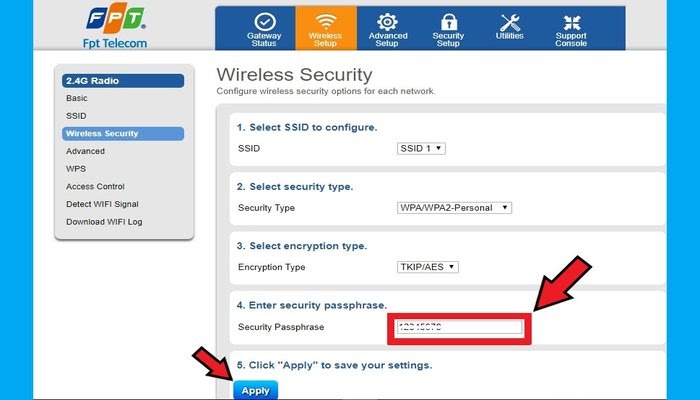 Bước 3: Tại mục Security Passphrase bạn tiến hành nhập vào mật khẩu mới rồi nhấn Apply để lưu lại. Nếu bạn muốn đổi thêm tên mạng wifi nhà mình hãy