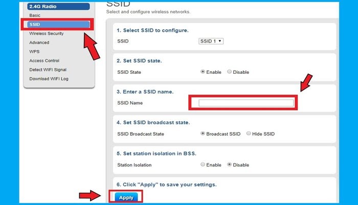 Bước 4: Tiếp tục đổi tên mạng bạn chọn vào SSID tại mục SSID Name nhập vào tên mạng mới rồi nhấn Apply để lưu lại thay đổi.