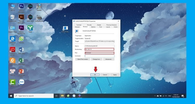 Bước 5: Tại tab Properties bạn chọn Run nhấn chọn Minimized. Tiếp theo bạn hãy nhập tổ hợp phím tắt để bật tính năng trong mục Shortcut Key rồi nhấn OK để hoàn tất.