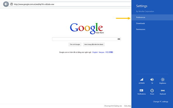 Mở cửa sổ thiết lập của Firefox Modern UI trên Windows 8