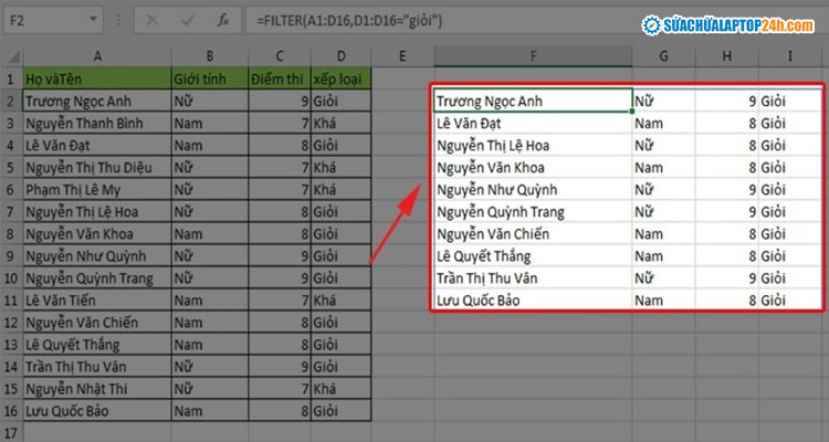 Trường hợp cần lọc ra số học sinh có điểm thi lớn hơn hoặc bằng 9, bạn chỉ cần thực hiện tương tự và nhập hàm =FILTER(A1:D16,C1:C16>=9).