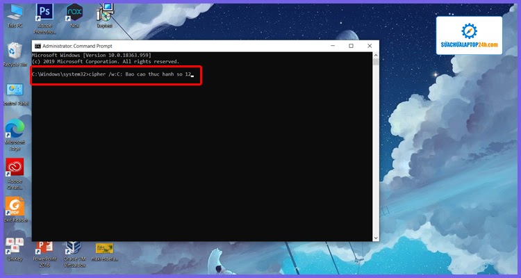 Bước 2: Tại Command Prompt bạn nhập câu lệnh cipher /w:C: và nhập kèm tên file cần xóa vĩnh viễn. Ví dụ: cipher /w:C: Bao cao thuc hanh so 12 sau đó nhấn Enter để Cipher làm nhiệm vụ của mình.