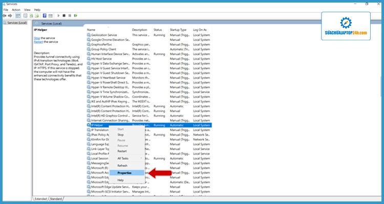 Bước 2: Tab services sẽ xuất hiện bạn hãy tiến hành tắt bớt các tiện ích không cần thiết, ví dụ: tắt IP Helper bạn hãy click chuột phải chọn Properties.