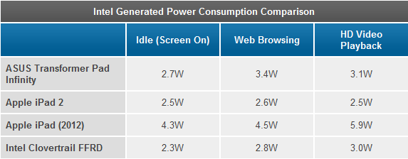 Intel cũng cung cấp một bảng so sánh về mức tiêu thụ điện của vài mẫu tablet điển hình. Theo đó giải pháp 32nm của hãng này có khả năng tiết kiệm không thua gì các giải pháp ARM hiện có trên thị trường, cho thấy một khả năng cạnh tranh đáng kể.