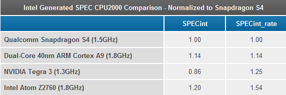 Tuy vậy hôm nay vẫn chưa phải ngày Windows 8 chính thức ra mắt, nên chúng ta chưa thể nói gì được về năng lực thực tế của các mẫu tablet Clover Trail. Theo một bảng so sánh dựa trên SPEC CPU2000 do Intel cung cấp thì con chip Atom 2 nhân 4 luồng (1,8 GHz) này mạnh gấp 1,2 lần Snapdragon S4 (1.5GHz) ở tính toán số nguyên và 1,54 lần ở tính số thực. Các giải pháp Cortex A9 2 nhân khác đều không bằng Clover Trail. Riêng bản Cortex A9 4 nhân của NVIDIA kém Clover Trail ở điểm số thực.