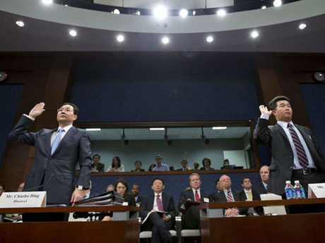 Charles Ding (bìa trái), đại diện Huawei và Zhu Jinyun, đại diện ZTE điều trần trước HIC ngày 13/9. Ảnh: AP.