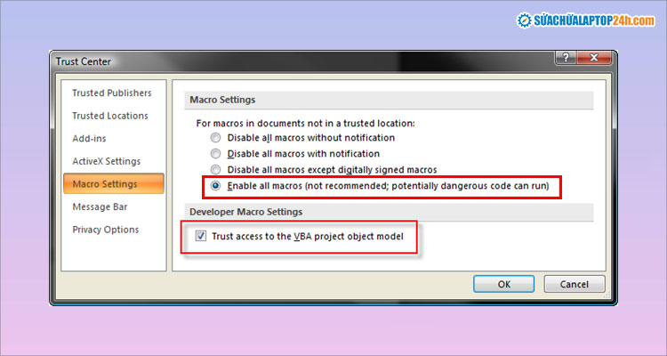 Bước 3: Chọn Enable all macros > tích vào Trust access to the VBA project object model.