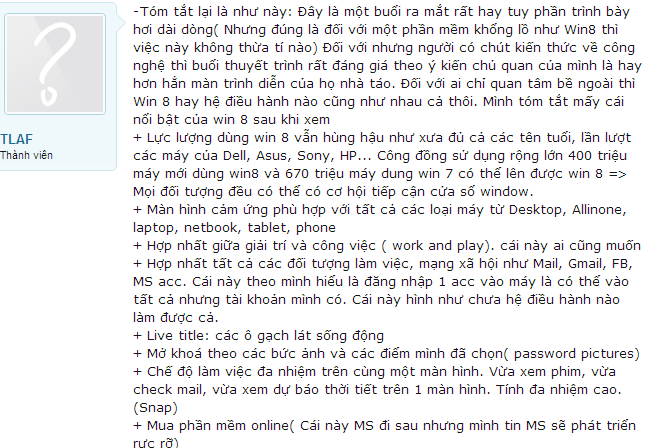 Ngoài topic lớn của diễn đàn Tinhte thu hút hơn 30 trang thảo luận của thành viên, còn lại ở nhiều trang mạng khác, những topic bàn luận về Window 8 chỉ có lác đác vài thành viên vào tham gia, thảo luận hay đăng mấy câu bâng quơ đại loại như "Mạng chậm quá", hay "up" để topic không bị chìm nghỉm. Nhiều thành viên nhận định, rõ ràng nếu so với Apple về cách PR và tổ chức sự kiện tới người dùng (qua hai sự kiện ra mắt iPhone 5 và iPad Mini thời gian qua), dường như Microsoft đã thua một bàn trông thấy.