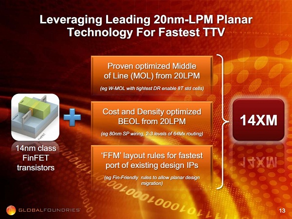 Song với 14XM, có một chi tiết đặc biệt: nó không phải 14 nm "thuần" mà là sự kết hợp giữa các trans 14 nm FinFET và công nghệ 20LPM hiện có của GF. Nên nói thêm rằng thực tế GF cũng đầu tư không ít cho tiến trình 20 nm, đặc biệt là phiên bản 20LPM vốn được tối ưu cho các thiết bị di động. Nhưng theo lộ trình mới đây nhất của hãng này thì GF chỉ khai thác dây chuyền 20 nm có duy nhất một năm (2013). Trong khi đó một hãng bán dẫn thường khai thác một node trong ít nhất hai năm (một phần để hoàn thiện thiết kế, phần khác để hoàn vốn R&D). Nếu chỉ dùng 20 nm trong một năm duy nhất, lỗ là điều khó tránh với GF.