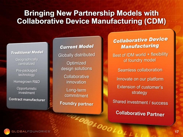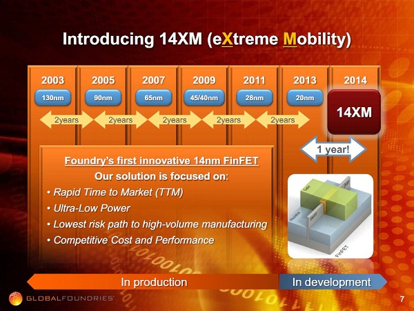 Có thể xem 14XM của GF là một điểm quan trọng cho công nghiệp bán dẫn. Vì thực tế số hãng có khả năng gia công ở công nghệ mới nhất và sản lượng lớn như GF không nhiều. Chỉ một vài cái tên như TSMC, UMC và Samsung là thực sự "cùng đẳng cấp" với GF. Một điểm chủ chốt ở đây: GF và Samsung cùng với IBM cùng thuộc một CLB bán dẫn có tên Fishkill. CLB này còn có thêm một vài hãng quan trọng khác như ARM, ST. Theo mô tả của GF, hãng này đã ký kết một thoả thuận làm ăn lâu dài với ARM, nhằm tối ưu dây chuyền sản xuất của mình cho các thiết kế ARM mới. Có được mối quan hệ hợp tác chặt chẽ này, những hãng thiết kế chip ARM khác đều có tiềm năng trở thành khách hàng cho GF.