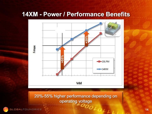 Cũng vì đặc trưng này, GF gọi tiến trình 14 nm mới của mình là 14XM (eXtreme Mobility) vì các khả năng tiết kiệm điện đáng kể của nó (vừa HKMG, vừa FinFET).