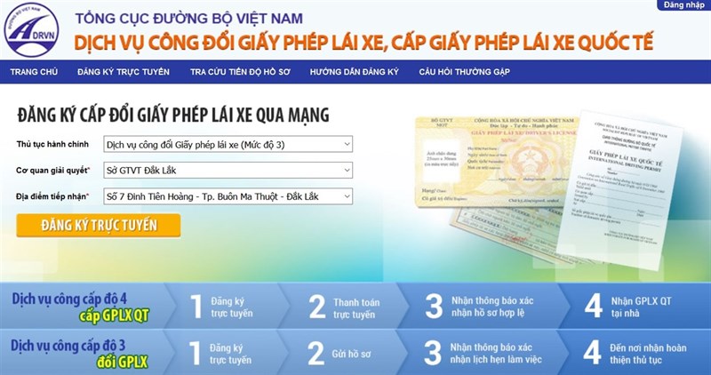 Bước 1: Để thực hiện đăng ký đổi giấy phép lái xe, cấp bằng lái xe quốc tế. Bạn nhấn liên kết dưới đây: