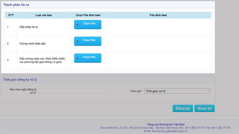 Tiếp theo là mục Thành phần hồ sơ, mục này gồm 3 loại văn bản, đây cũng chính là các loại giấy tờ để các bạn mang đến khi làm thủ tục đổi GPLX. Các bạn có thể chụp ảnh rồi insert vào file Word rồi gửi lên là được. Nếu upload file khác, phải đúng định dạng quy định là: doc, docx, xls, xlsx, pdf, png, jpg, jpeg, gif và dung lượng file không lớn hơn 5MB.