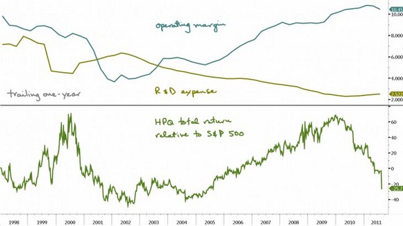 Ta có thể thấy, từ năm 2002 cho tới 2011, trong khi khoản chi phí hoạt động(operating margins) tăng lên, thì chi phí dành cho R&D cũng đồng thời giảm xuống. Điều đó đã chứng minh một cách rất rõ ràng, rằng trong gần một thập kỷ đó, HP đã chú trọng chạy theo lợi nhuận trước mắt để làm hài lòng giới đầu tư tài chính, hơn là chi cho phát triển "căn cơ" về lâu dài.