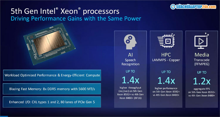 Một sản phẩm mới khác trong sự kiện trọng đại lần này của Intel chính là bộ vi xử lý Intel Xeon Emerald Rapids thế hệ thứ 5 - sẽ thay thế dòng chip Xeon Sapphire Rapids thế hệ thứ 4 hiện tại. Emerald Rapids sẽ giúp Intel tăng tốc các chip máy chủ của mình với Raptor Lake.