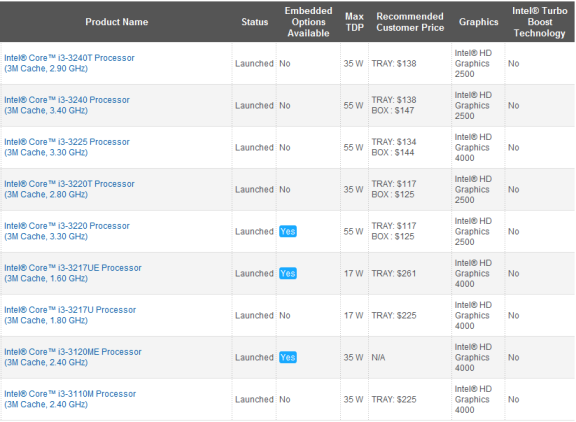 Ngoài các model thường với mức TDP 55W, Intel còn tung ra thêm các phiên bản tiết kiệm điện với TDP 35W và 17W với ký tự T hoặc U ở cuối tên model. Nhân x86 của các chip Core i3 không kèm theo tính năng Turbo như nhân IGP nên chúng chỉ có một mức xung mặc định duy nhất. Model mạnh nhất trong lần ra mắt này là i3-3240 có xung CPU 3,4 GHz song lại kém về mặt đồ hoạ vì dùng IGP HD Graphics 2500. Model i3-3225 tuy xung CPU chỉ đạt 3,3 GHz song IGP lại tới HD Graphics 4000.