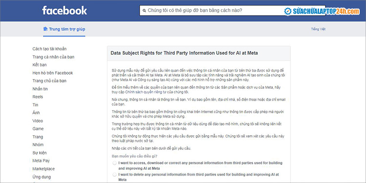 Biểu mẫu quyền của chủ thể dữ liệu đối với thông tin của bên thứ ba được sử dụng cho AI trên Facebook.