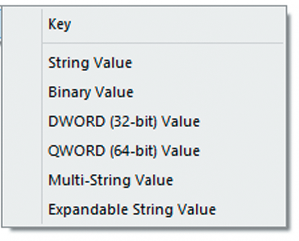 Các khóa chính này được chia làm nhiều khóa con, các khóa con sẽ chứa các mục mang giá trị có thể thay đổi được. Các khóa con của Registry có thể chứa một trong các kiểu giá trị sau: kiểu chuỗi (String), kiểu nhị phân gồm hai giá trị 0 hay 1 (Binary), kiểu giá trị nguyên 32 bit không dấu (DWORD), kiểu giá trị nguyên 64 bit không dấu (QWORD), kiểu giá trị nhiều chuỗi (Multi-String), kiểu chuỗi mở rộng (Expandable String).