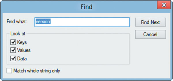 Do số lượng khóa trong cây dữ liệu registry rất lớn, vì thế, thông thường người dùng sẽ phải sử dụng tính năng tìm kiếm để dò đến nhánh cần thiết trong cây. Để thực hiện việc tìm kiếm, bạn dùng menu Edit – Find, hay nhấn tổ hợp phím Ctrl – F. Trong cửa sổ Find, bạn gõ chính xác một phần tên khóa cần tìm vào ô Find what. Sau đó, thì tùy vào việc bạn muốn tìm kiếm theo khóa (Keys), giá trị khóa (Values), hay dữ liệu (Data), mà bạn đánh dấu chọn vào các ô tương ứng. Nếu phần chuỗi tìm kiếm bạn gõ vào có khoảng trắng giữa các từ, thì hộp chọn Match whole string only sẽ yêu cầu chương trình Registry Editor chỉ đưa ra khi tìm thấy cả chuỗi đã nhập, chứ không tìm theo từng từ riêng lẻ.