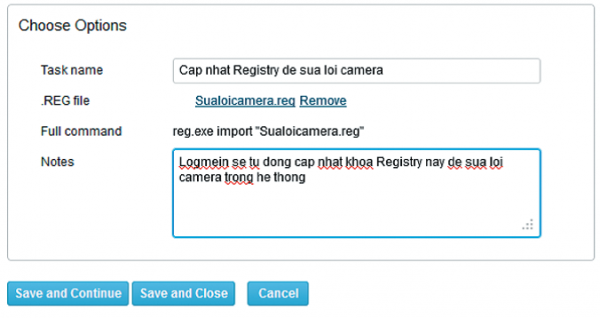 Chúng ta sẽ quay trở lại với chức năng áp registry từ dịch vụ LogMeIn vào nhiều máy tính ở xa đang nói ở trên. Sau khi chọn kiểu tác vụ là Update registry settings, bạn vào tiếp mục Choose Options và cài đặt các tham số. Sau khi nhập tên tác vụ trong mục Task name, bạn bấm vào nút Browse cạnh mục .REG fi le, rồi chọn tập tin .reg mà bạn đã tạo ra trong bước trước. Tập tin .reg sau khi tải lên xong sẽ xuất hiện trong danh sách, và bạn vẫn có thể xóa nó đi bằng nút Remove.