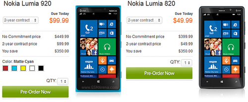 Giá bán Lumia 820 và 920 không hợp đồng ở Mỹ.