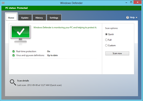 Kể từ Windows 8 Microsoft đã tích hợp sẵn công cụ diệt virus vào trong Windows nhằm ngăn chặn tối thiếu việc virus xâm nhập hoặc lây lang bởi đôi khi người dùng sau khi cài đặt hệ điều hành và ứng dụng có thể bỏ qua phần mềm diệt virus. Nếu bạn đã từng sử dụng qua ứng dụng diệt virus miễn phí của Microsoft là Microsoft Security Essentials sẽ ngay lập tức nhận ra giao diện quen thuộc này, đơn giản là Microsoft chỉ thay đổi tên của ứng dụng thành Windows Defender mà thôi.