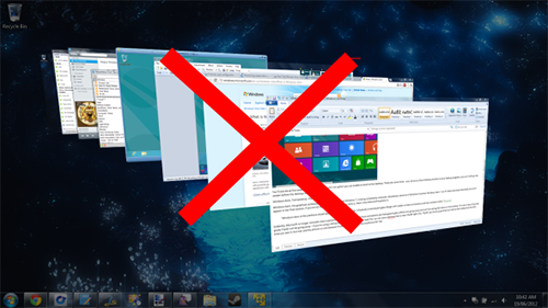 Tương tự như vậy, hiệu ứng chuyển cửa sổ giữa các ứng dụng đang mở Flip 3D cũng đã bị loại bỏ, việc này không quá bất ngờ bởi trong thực tế không mấy ai quan tâm đến tính năng này mà đơn giản là nó chỉ góp phần gây ấn tượng với khách hàng với hiệu ứng 3D độc đáo khi mới ra mắt.