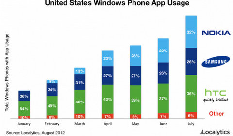 Tuy nhiên ở riêng thị trường Mỹ, báo cáo của Localytics cho thấy thị phần Windows Phone Nokia chỉ xếp ở vị trí thứ hai, sau đối thủ tới từ Đài Loan, HTC. Một trong những nguyên nhân khiến cho tỷ lệ của Nokia thấp hơn HTC 4% là ở việc Nokia chậm đưa các mẫu Lumia tới Mỹ, khi phải tới đầu năm nay sản phẩm phẩm mới xuất hiện tại các cửa hãng bán lẻ.
