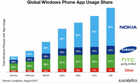 Đây là kết quả từ thống kê do Localytics vừa thực hiện thông qua việc sử dụng các ứng dụng trên chợ Market Place của Windows Phone. Tính ở thị trường toàn cầu, Nokia đang chiếm tới một nửa số lượng Windows Phone 7 hiện có. Tính trong tháng 5 vừa rồi, thị phần của dòng sản phẩm Lumia đã vượt qua mốc 50% và đang tiếp tục đà tăng lên.