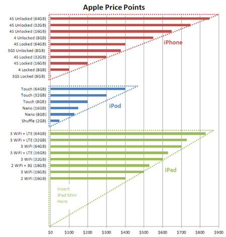 Đó không chỉ là lý do duy nhất mà Táo Khuyết muốn đưa ra một iPad mini với mức giá rẻ hơn bởi theo truyền thống, Apple luôn tung ra thị trường những thiết bị sở hữu tính năng hấp dẫn cực kỳ lớn mức giá cao để chiếm lấy niềm tin người dùng. Sau đó, hãng sẽ dần dần dần xâm lấn toàn bộ thị trường bằng các duy trì những phiên bản giá rẻ hơn nhằm cắt đứt mọi nỗ lực cạnh tranh từ các đối thủ. Đây là một chiến lược rất thành công của các thế hệ iMac sau đó là iPhone và có vẻ như lần này sẽ là iPad mini. Có thể tóm tắt chiêu “bao phủ thị trường” mà vẫn không làm ảnh hưởng đến tỷ suất lợi nhuận của Apple bằng công thức:
