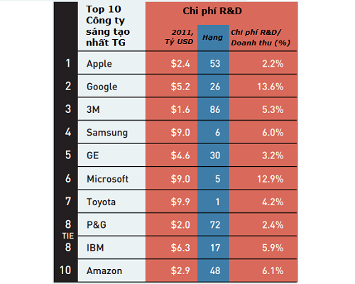 "Trong 8 năm qua, gần như không có bất kỳ mối liên hệ (về mặt số liệu) giữa chi phí R&D và năng lực sáng tạo của các công ty" Barry Jaruzelski - Chuyên viên của Booz & Co cho biết. Bằng chứng là chỉ có 3 hãng nằm trong Top 10 công ty chi tiêu nhiều nhất cho mảng R&D được lọt vào Top 10 công ty sáng tạo nhất thế giới - Toyota, Samsung, Microsoft.