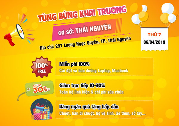 SUACHUALAPTOP24h.com đã chính thức có mặt tại tỉnh Thái Nguyên! Nhằm đáp ứng nhu cầu và niềm mong mỏi bấy lâu của quý khách hàng khu vực Thái Nguyên và cũng để nối dài thành công của toàn hệ thống, SUACHUALAPTOP24h.com tưng bừng khai trương cơ sở số 297 Lương Ngọc Quyến, thành phố Thái Nguyên với ngàn quà tặng hấp dẫn trong tuần lễ khai trương từ ngày 6/4/2019 đến ngày 12/4/2019.